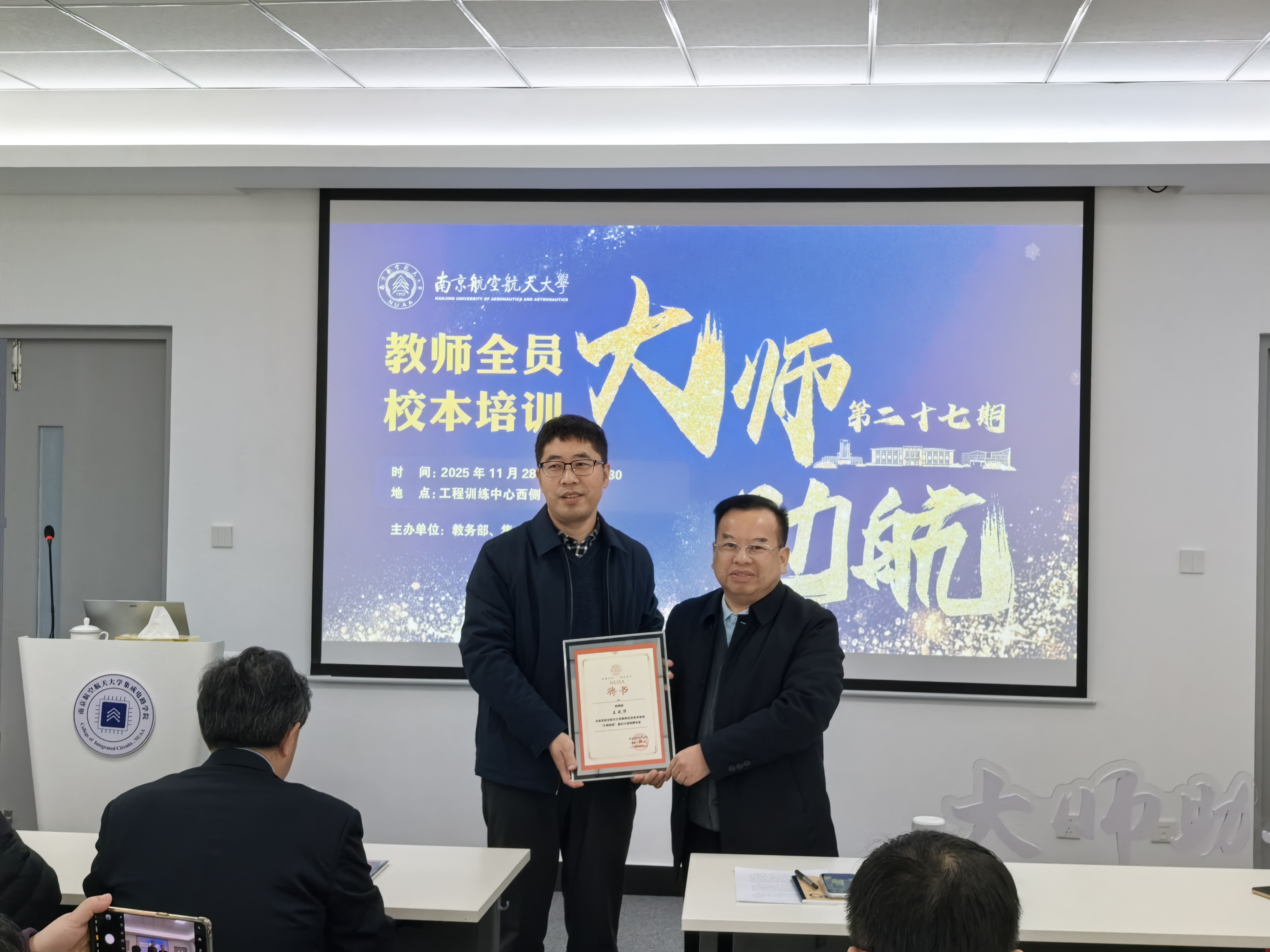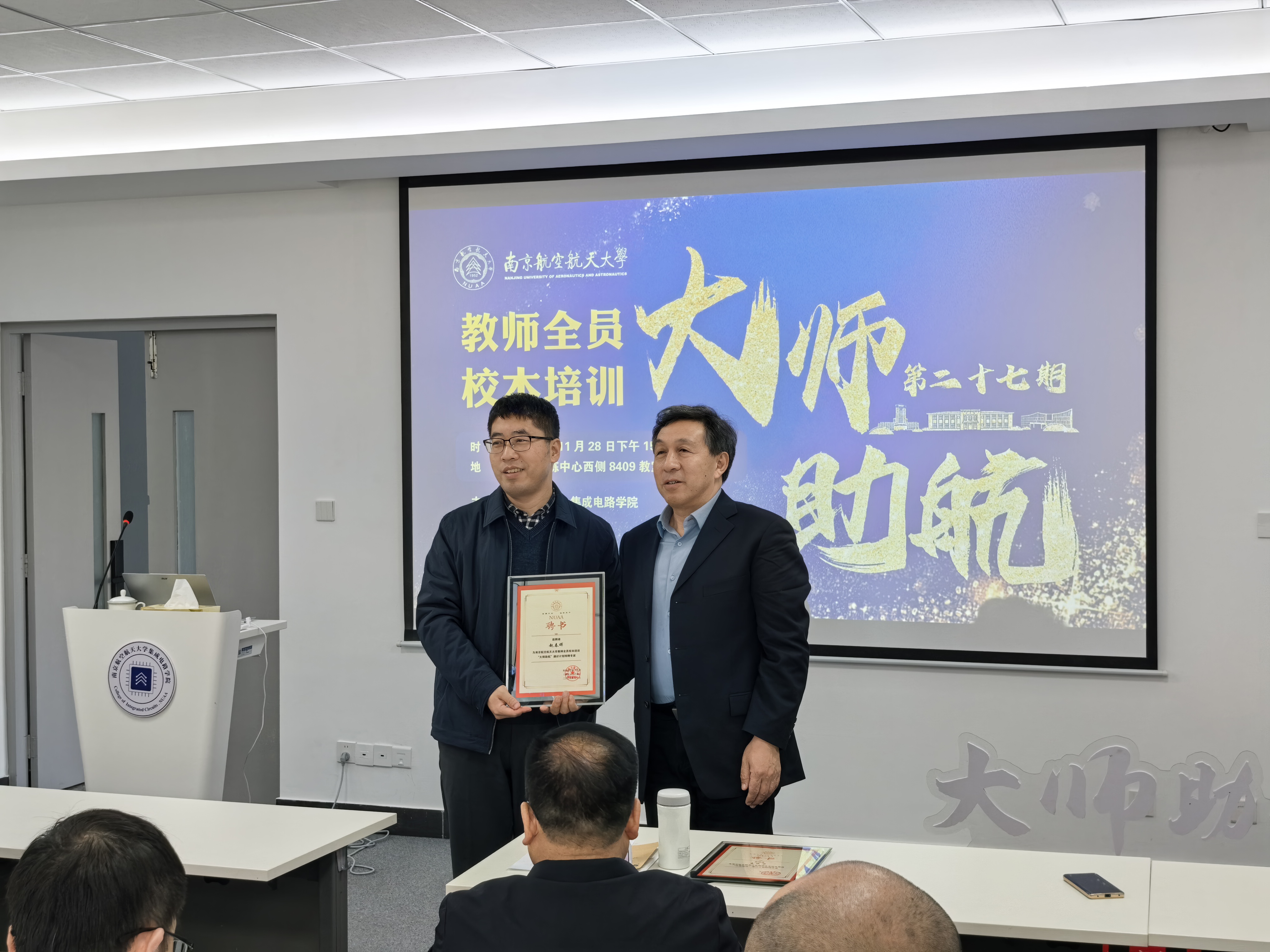 报告会现场举行了全员校本培训“大师助航”通识计划特聘专家的受聘仪式。李晋斌主任为赵春晖教授以及王成华教授颁发聘书。