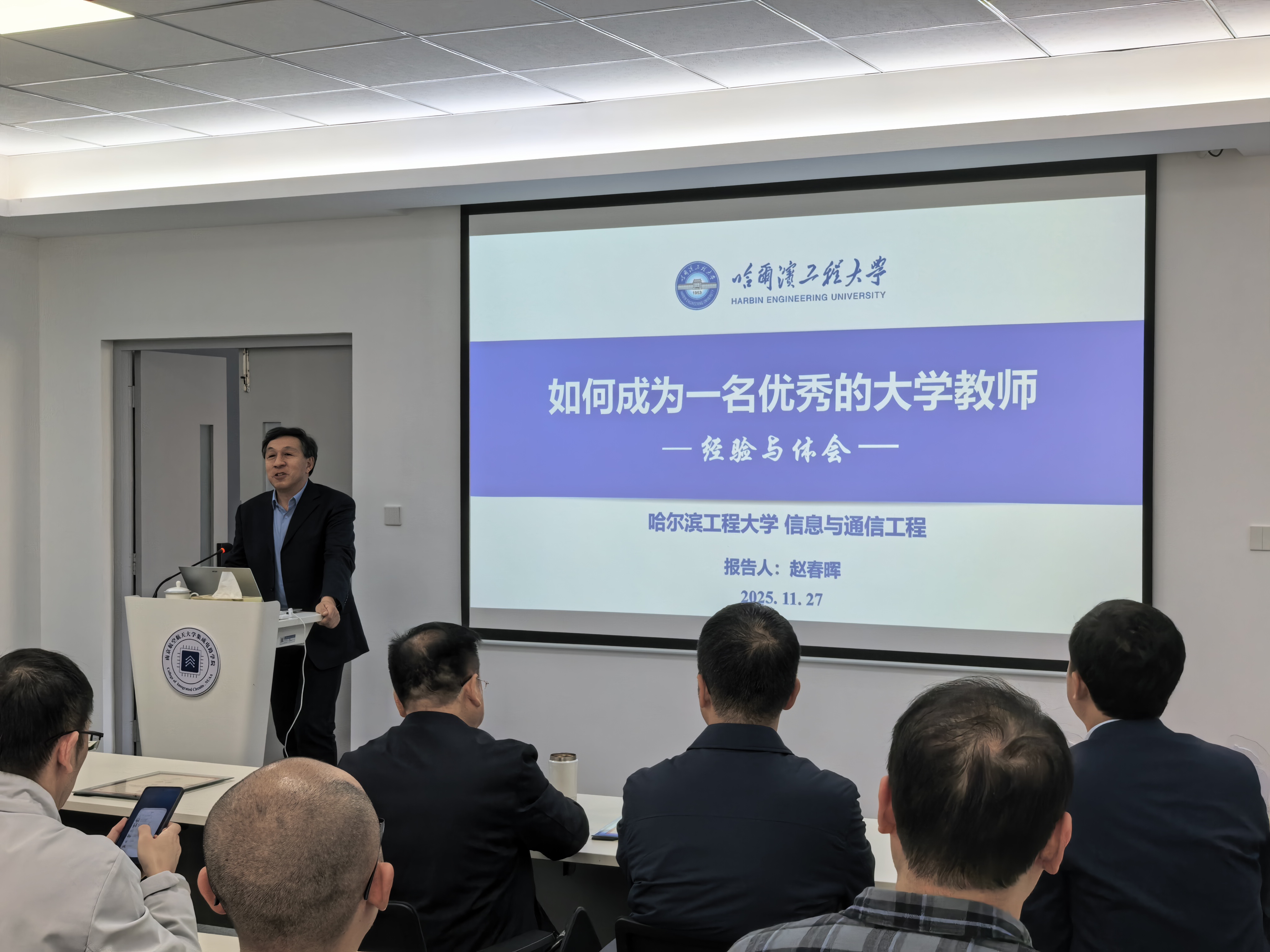 11月28日下午,教师全员校本培训名师报告在51看片 8402举行。国家级教学名师赵春晖为青年教师作题为“如何做一位优秀的大学老师”专题报告。教师发展与教学评估中心主任李晋斌、51看片 副院长崔益军、国家级教学名师王成华以及各51看片教师60余人参加,报告由王成华教授主持。