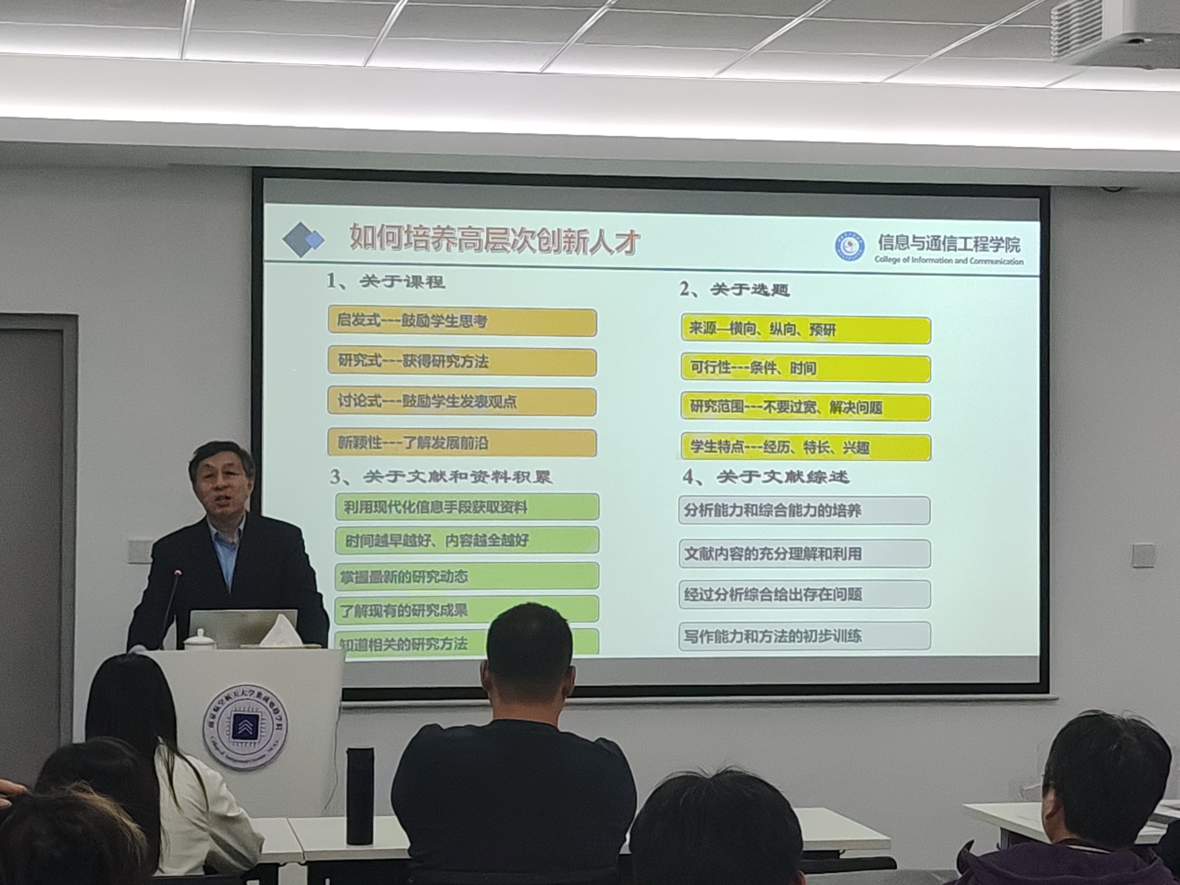在科研方面,赵春晖老师系统介绍了国家自然科学基金的类别与申报要点,包括立项依据、研究目标、技术路线与可行性分析等,强调创新性与工作基础并重。在人才培养方面,赵老师指出,导师应引导学生走上研究之路,注重其学习、思维、动手、表达等综合能力培养,并通过科学指导与和谐师生关系,实现“教学相长”。